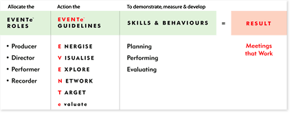 EVENTe™ - an innovative strategy to make meetings work. Lack of planning, poor management, ‘silent’ participants, no timeframes, ineffective decision-making processes, failure to share and value ideas, loss of focus and objectives not achieved…. All too often meetings don’t work! 'EVENTe™ - an innovative strategy to make meetings work’ is presented as a ‘meetings workshop’ in which roles are allocated, the EVENTe™ Guidelines actioned and meeting skills demonstrated, measured and developed to ‘make meetings work’. Ten highly practical techniques support the development of critical meeting skills and constructive meeting behaviours.